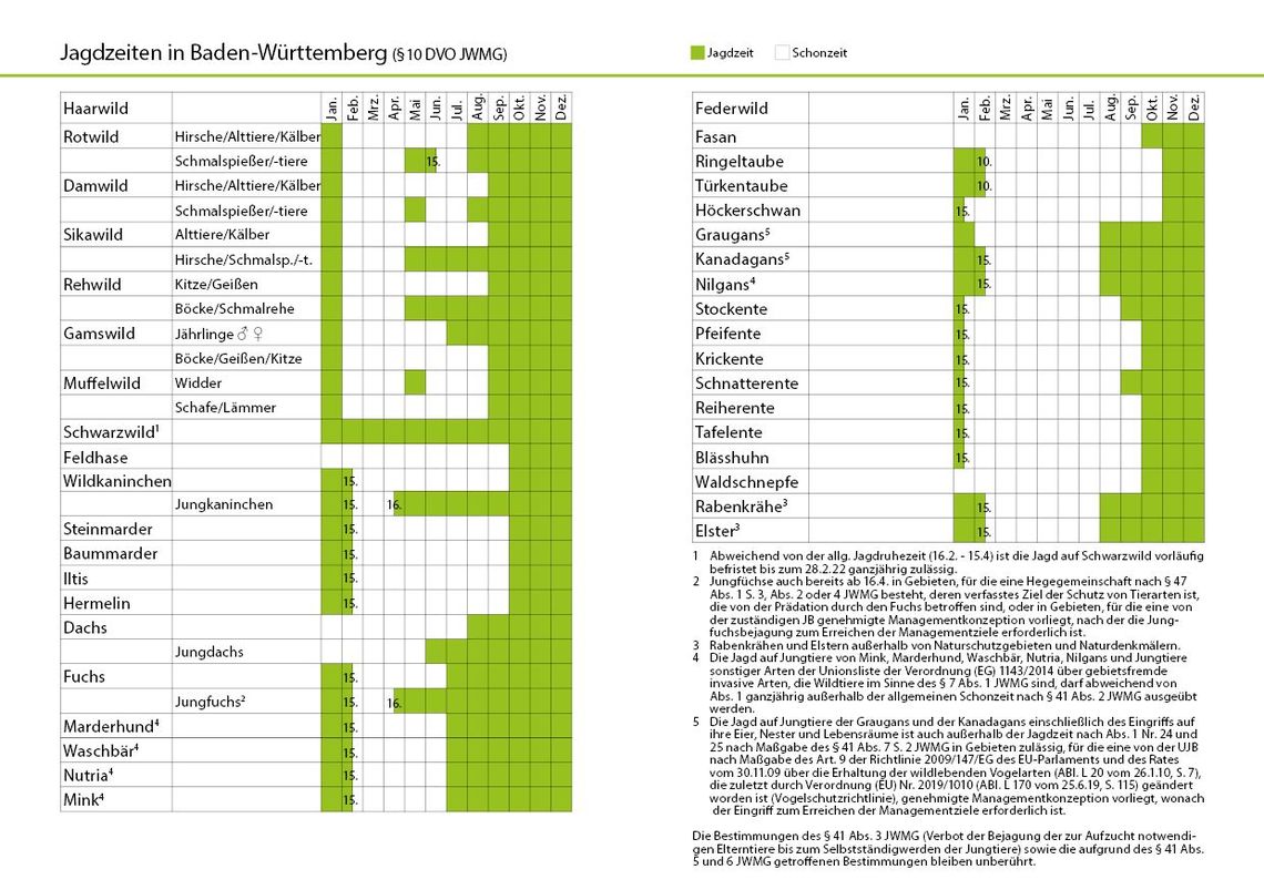 Startseite WaiblingenDie JägervereinigungAktuellesIn der Änderung der Durchführungsverordnung zum Jagd-und Wildtiermanagmentgesetz, die am 1.7.2021 in Kraft trat, wird die neue im JWMG in § 41 Abs. 2 allgemeine Jagdruhezeit berücksichtigt.